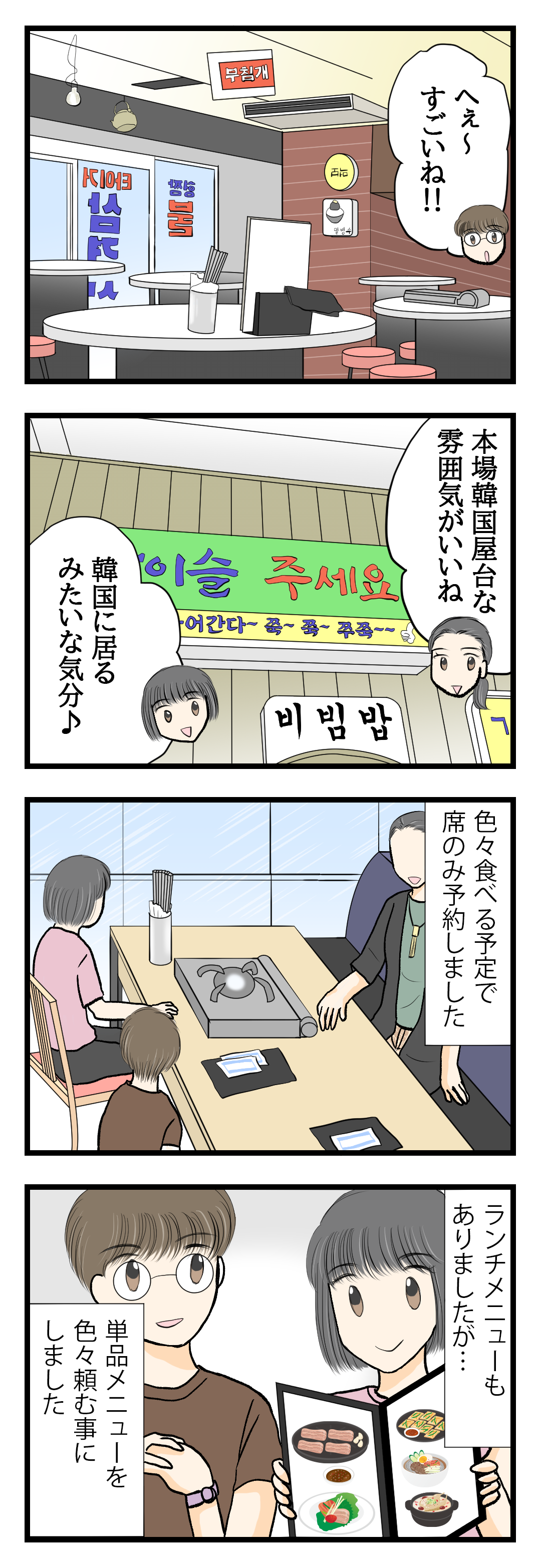 2025年11月25日 日本で味わえる!韓国ソウルの屋台街でマシッソヨ!!④店内が本場韓国屋台でいい感じ♪よし注文するぞ! [前回の話] 韓国ソウルの屋台街でマシッソヨ!!① 韓国ソウルの屋台街でマシッソヨ!!② 韓国ソウルの屋台街でマシッソヨ!!③ 今回お邪魔した「ヒョンチャンプルコギ」さんは、店内が韓国ソウルの屋台街みたいな雰囲気で、「韓国にいるみたい~」な気分が味わえました。あと、実際働いている方も韓国人スタッフもいました!もちろん日本語OKでしたよ( ̄∀ ̄)ランチタイムに席予約して訪問しました。もちろんランチメニューもあったのですが、今回は「娘っ子が韓国料理どれだけ食べられるか?」を試したかったので、ランチメニューで注文せず、単品で色々注文する事にしました。よーーーーし、注文するぞ~~~(≧▽≦)続きます~p(*^-^*)q次の話を読む よかったらポチっと1回押してください~♪人気ブログランキング 【ブログ連載/完結シリーズ】